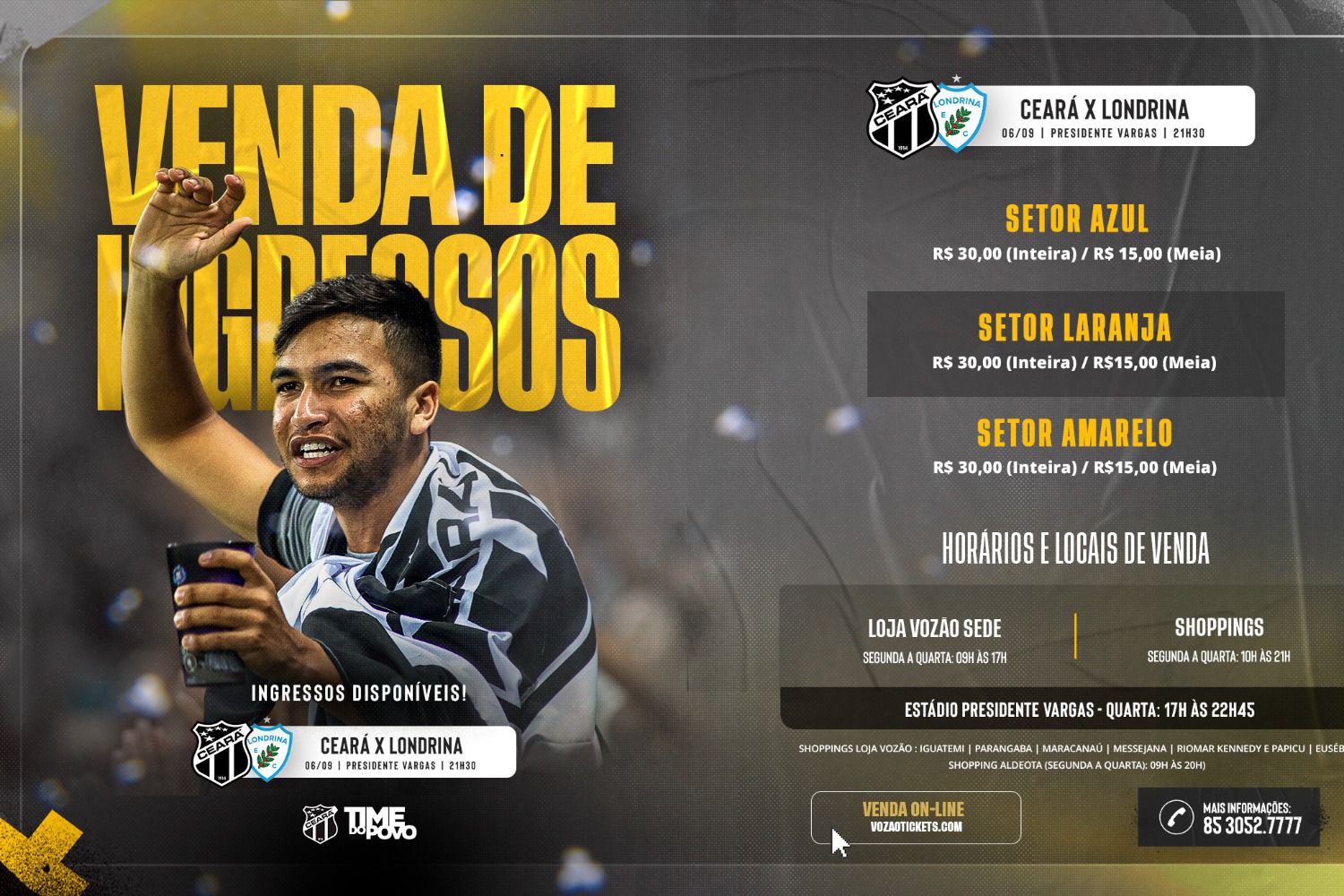 Na próxima quarta-feira, 6, o Ceará recebe o Londrina, em mais uma rodada do Campeonato Brasileiro Série B. A partida será no estádio Presidente Vargas e, na tarde desta segunda-feira, o Alvinegro iniciou a venda de ingressos para o confronto.