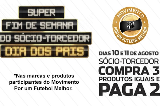 Os alvinegros que têm amor pelo Vozão terão mais um motivo para encher o carrinho de compras: vem aí o “Super Final de Semana do Sócio Torcedor Dia dos Pais”, com a promoção “Sócio Torcedor Compra 3 Produtos Iguais e Paga 2”. Nos dias 10/08 (sábado) e 11/08 (domingo), os consumidores participantes do Movimento Por Um Futebol Melhor terão a oportunidade de aproveitar benefícios que vão além das vantagens já obtidas no seu dia a dia.