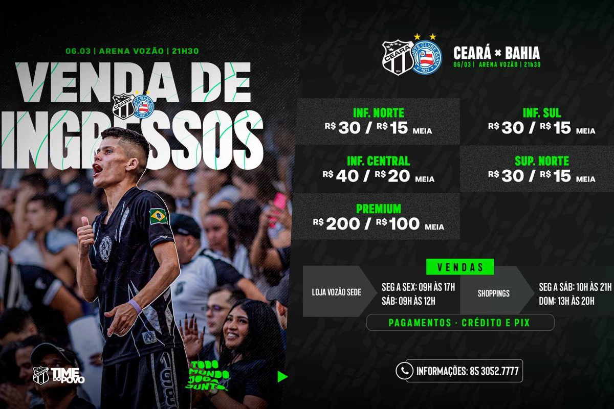 No dia da partida, a bilheteria 01 da Arena Castelão estará disponível das 16h30 às 22h45.