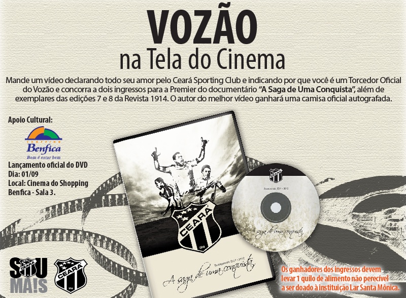 Os Torcedores Oficiais do Mais Querido terão a oportunidade de comparecer à sessão privada, participando da promoção “Vozão na Tela do Cinema”. Para isso, basta enviar um vídeo com duração máxima de 01 minuto declarando todo o seu amor pelo Ceará Sporting Club, com nome completo e a matrícula de Torcedor Oficial para o e-mail: promocao@soumaisceara.com.br.
